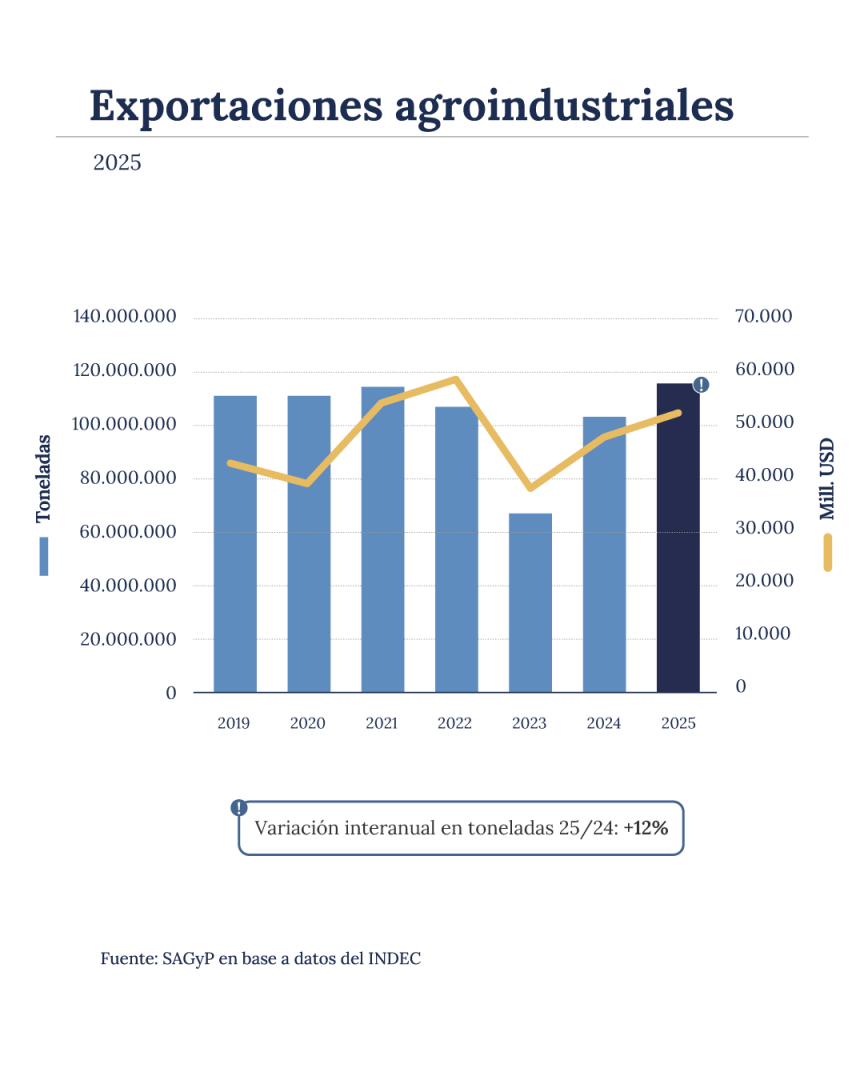 Según informó la Secretaría de Agricultura, Ganadería y Pesca del Ministerio de Economía, el año cerró con un aumento del 12 % en volumen exportado. En total, se alcanzaron 115,41 millones de toneladas. Además, el valor creció un 9 %, llegando a 52.337 millones de dólares, de acuerdo con datos del INDEC procesados por la Subsecretaría de Mercados Agroalimentarios e Inserción Internacional.