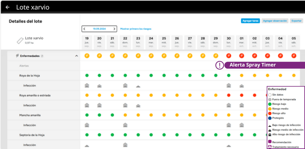 Spray Timer forma parte de la plataforma xarvio® FIELD MANAGER y funciona como un sistema de alerta temprana. A través de un modelo agronómico avanzado que integra datos climáticos, fenológicos y sanitarios, emite señales de riesgo (bajo, medio o alto) directamente al celular o computadora del usuario.